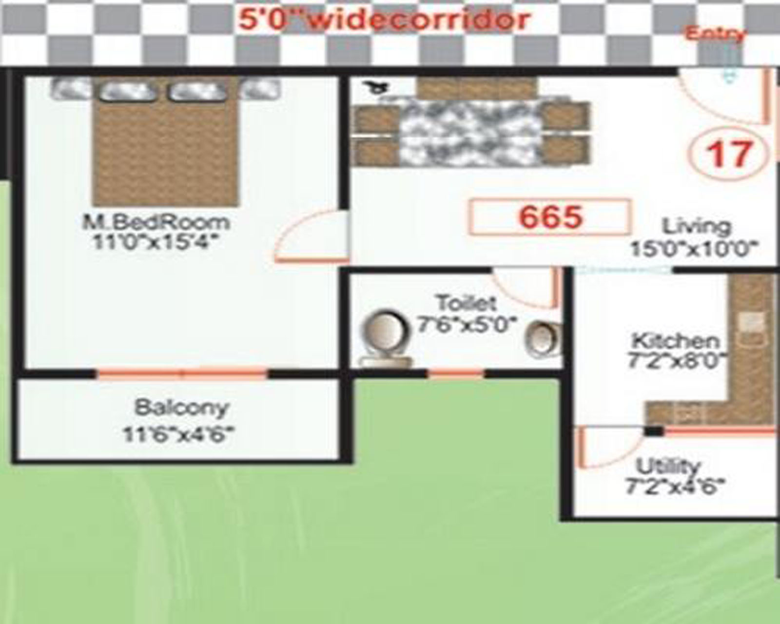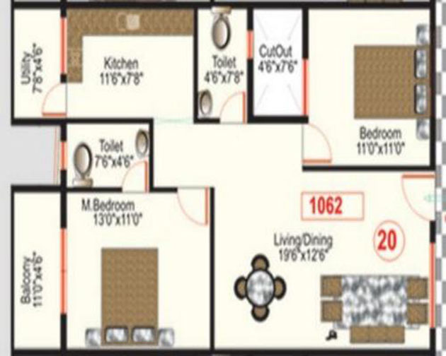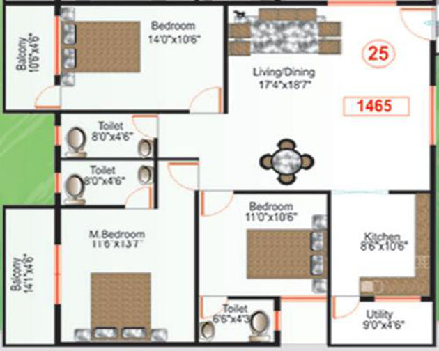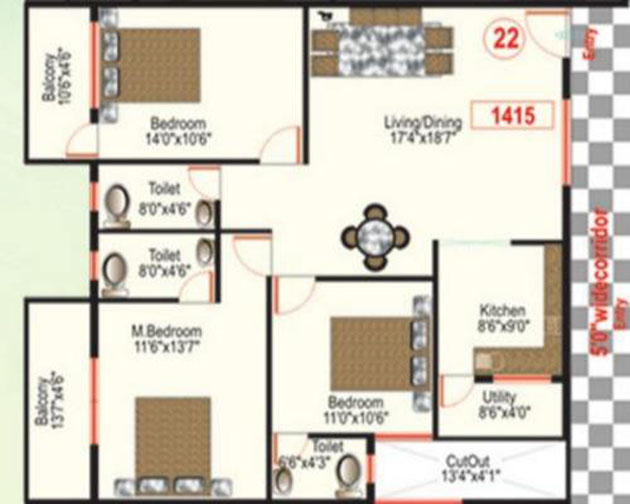 Vitrified tile flooring in Living, Dining and Bed rooms. Ceramic tile flooring for other areas.